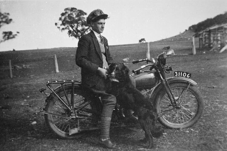 A young man on a Harley Davidson motorbike. He holds a dog with the offensive name 'N****r'.