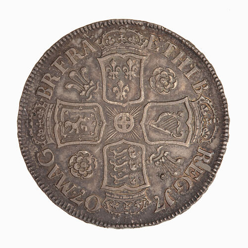 Crowned shields - with arms of England and Scotland halved at top and bottom, Ireland at left and France at right, forming a cross shape with the badge of the Star of the Garter at the centre; around, MAG BRI FR ET HIB REG 1707, the date being divided by the crown above the top English and Scottish shield.