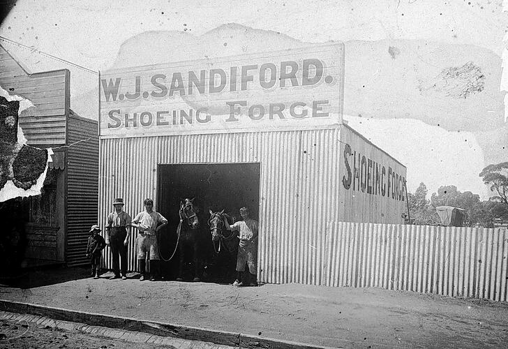 Three men and a small boy with two horses at the W. J. Sandiford Shoeing Forge.
