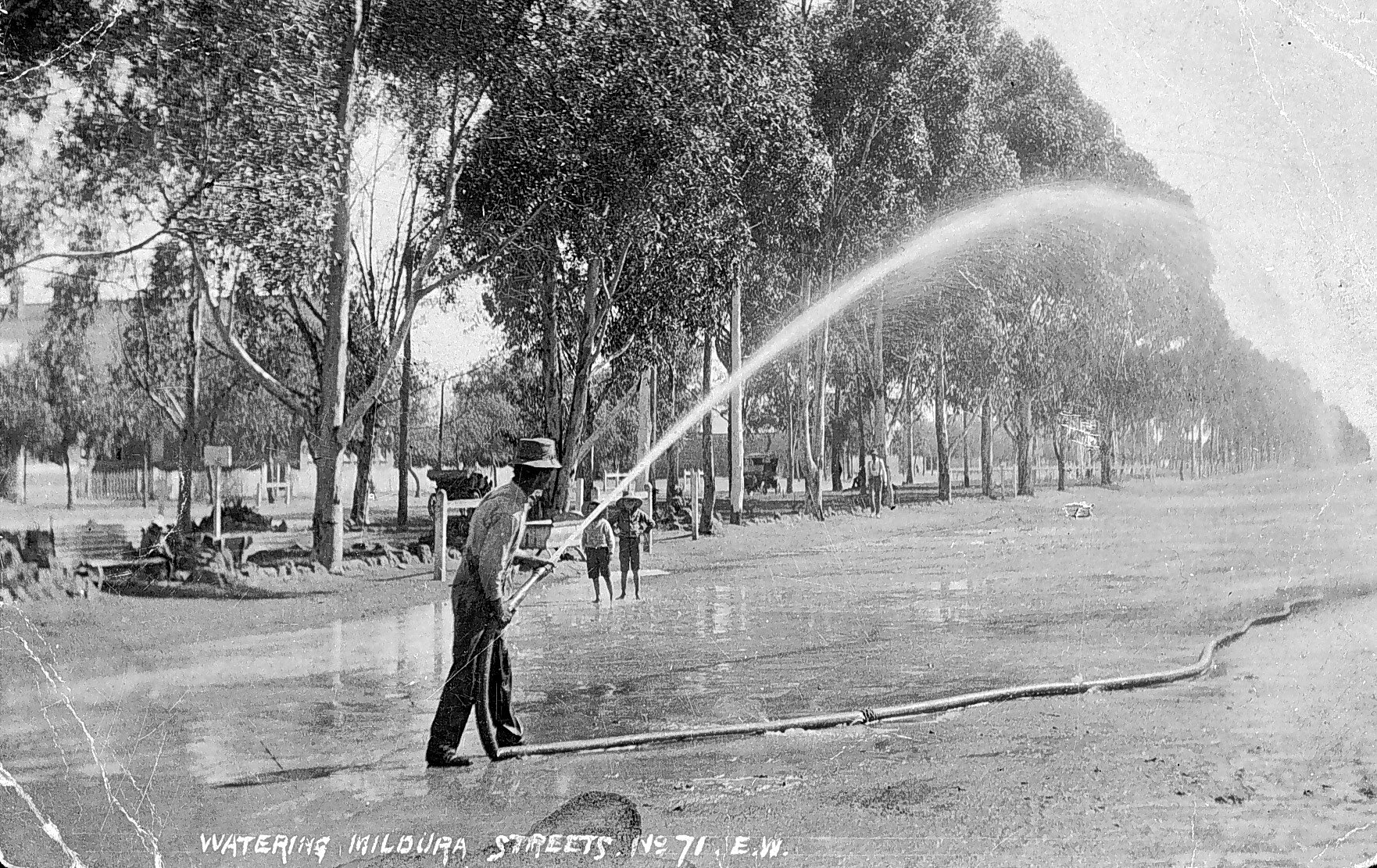 A man using a fire hose to water a street. Two small boys stand in the background.