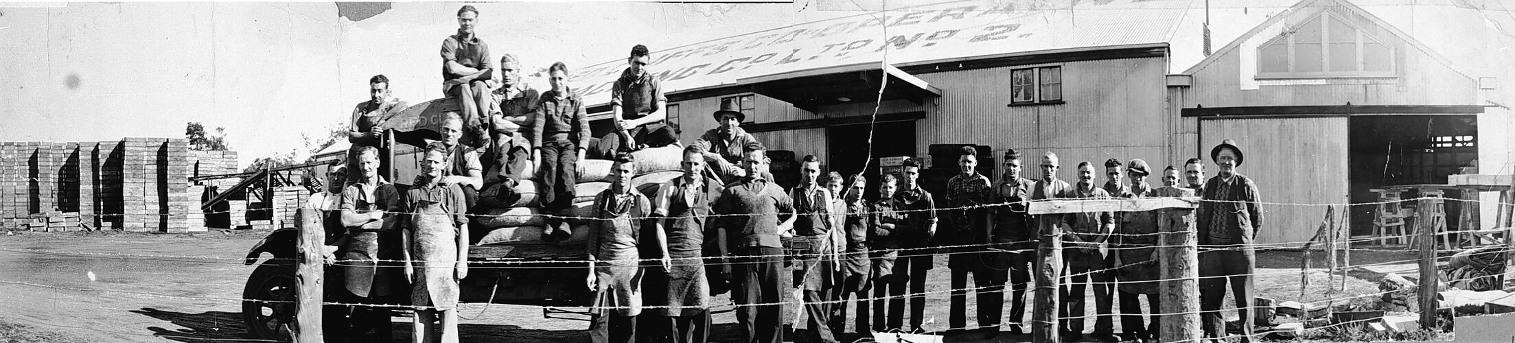 A group of workers in front of the packing shed of the Red Cliffs Co-Operative.