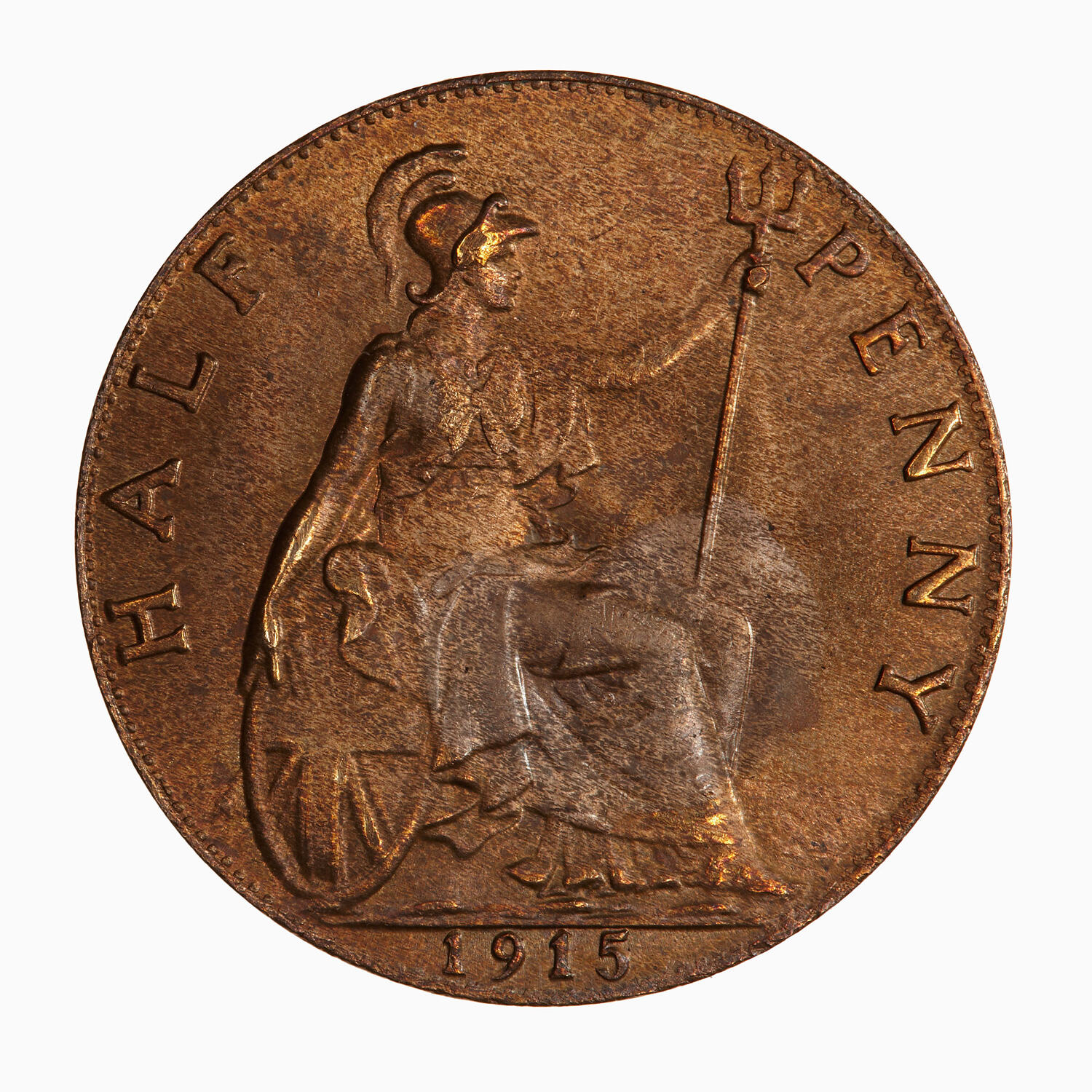 Britannia seated facing right on a rock wearing a helmet and flowing robes; she holds a trident and rests her right hand on a shield which bears the combined crosses of the Union Flag; around, HALF PENNY; in exergue, 1915