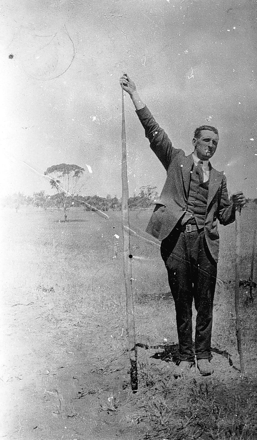 A man holding a dead snake.