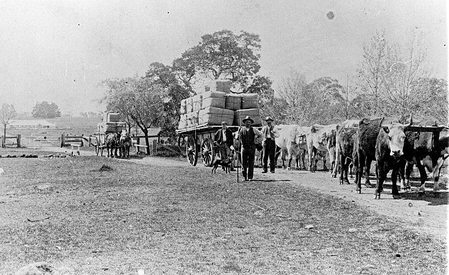Agricultural Produce, Agricultural Workers, Bullock Drivers, Bullock Teams, Dogs, Domestic Animals, Drays & Wagons, Farms, Horsedrawn Vehicles, Wool Bales