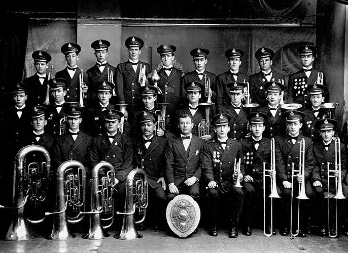 The Bendigo Brass Band. Many of the members wear medals and there is a shield displayed in front of the band.