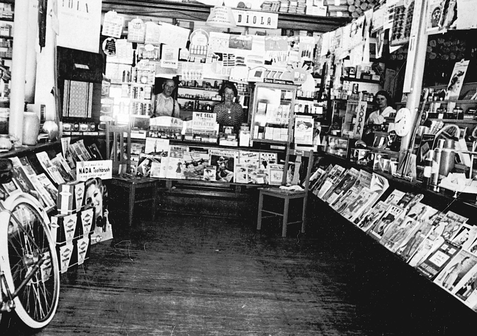 Inside a general store. Magazines are displayed and there is a bicycle on the left.