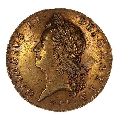 Young laureate head of George II facing left; below E.I.C.; around, GEORGIVS . II . DEI . GRATIA .