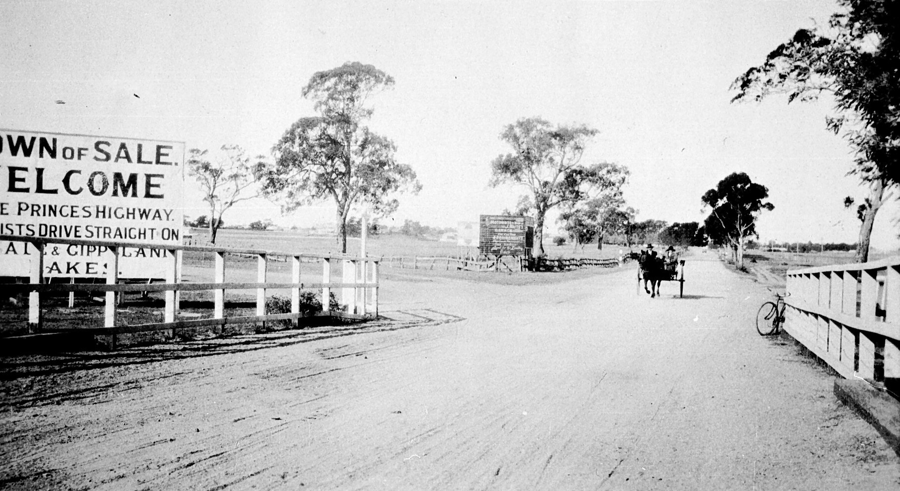 Welcome sign on the princes highway for the town of Sale. There are two people in a horse and buggy in the distance and a bicycle leaning against a fence on the right.