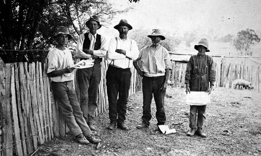 Five shearers on the D & H Jones farm. Two are reading newspapers.