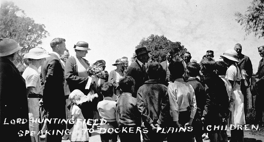 Lord Huntingfield, Governor of Victoria, speaking with children at Docker 's Plains.