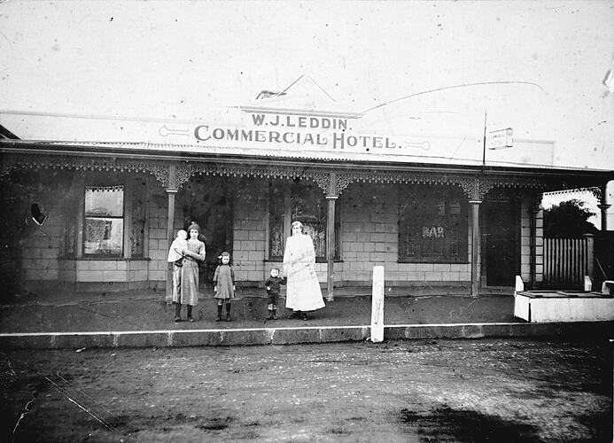 Members of the Leddin family outside W.J. Leddin 's Commercial Hotel. The hotel is single storey with a wide verandah decorated with iron lacework. It appears to be timber with a decorative facade made to look like brick.
