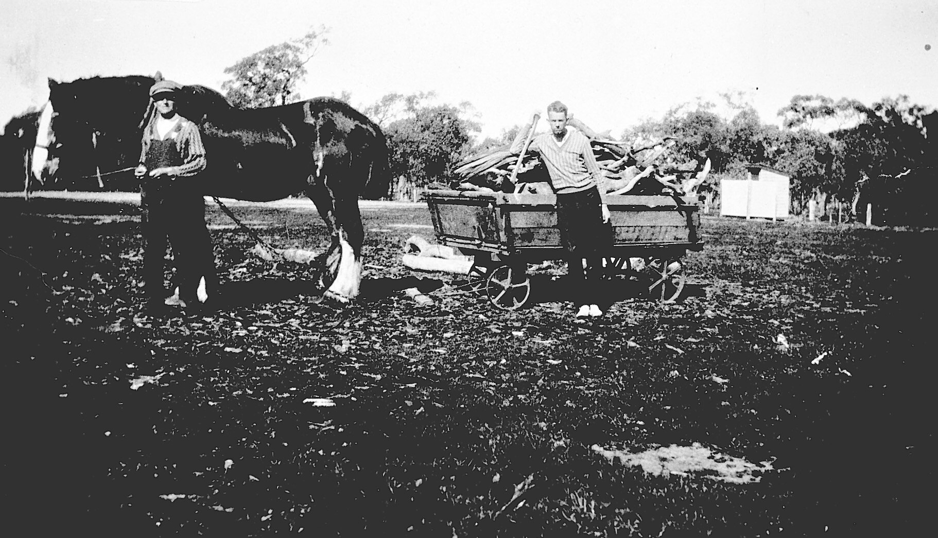 Men collecting wood in a horse-drawn wagon.