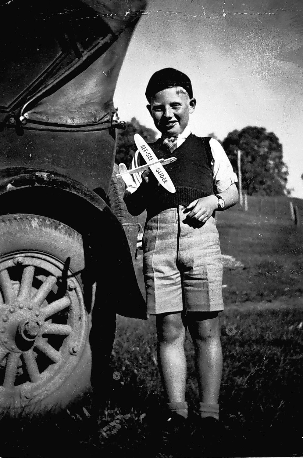 A boy standing beside a car and holding a toy glider.