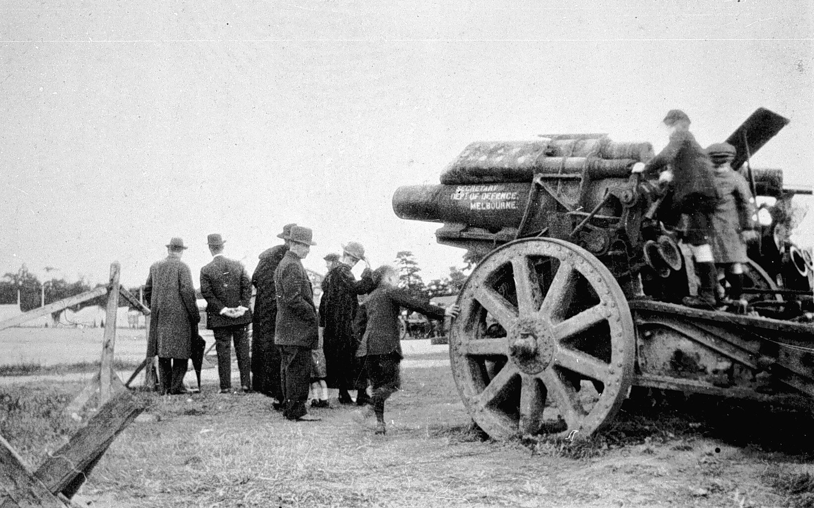 Two small boys climbing on a German 21cm Morser captured during World War One. A sign on the side of the gun reads: 'Secretary...Dept. of Defence, Melbourne'.