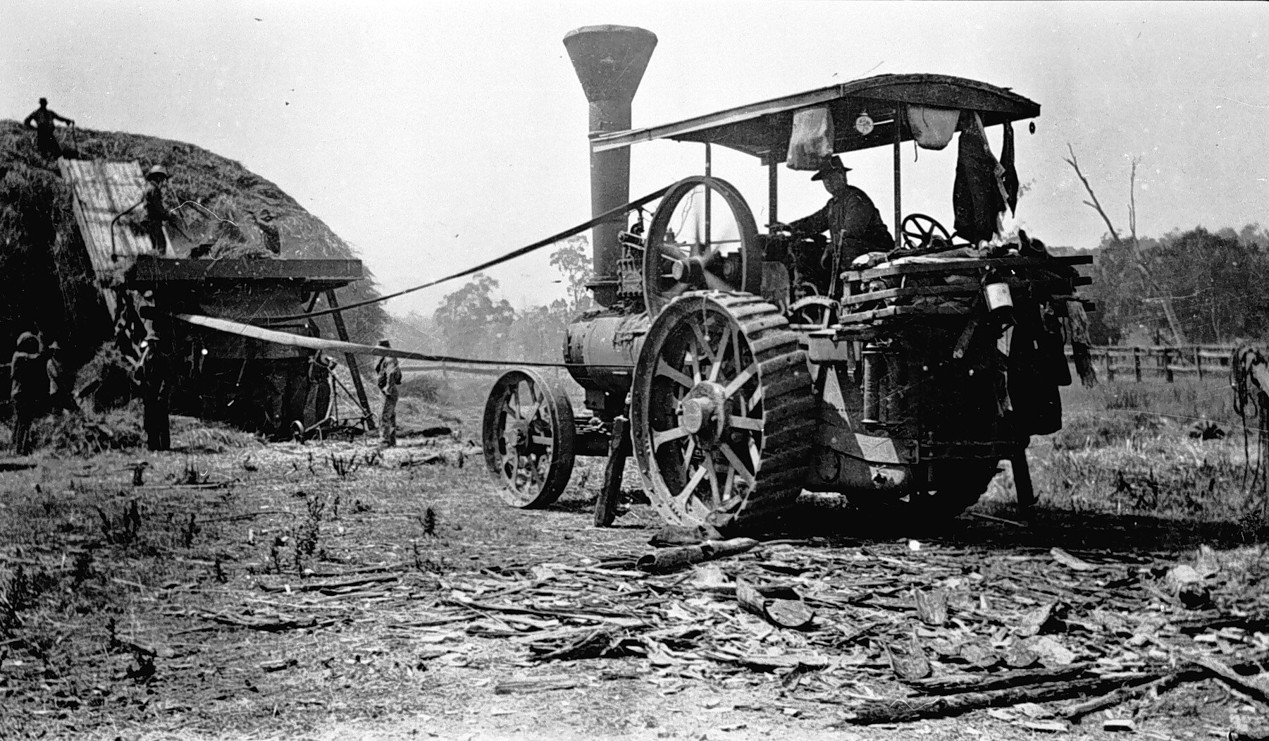 Wyllie 's thresher team in operation. There is a steam traction engine in the ground.