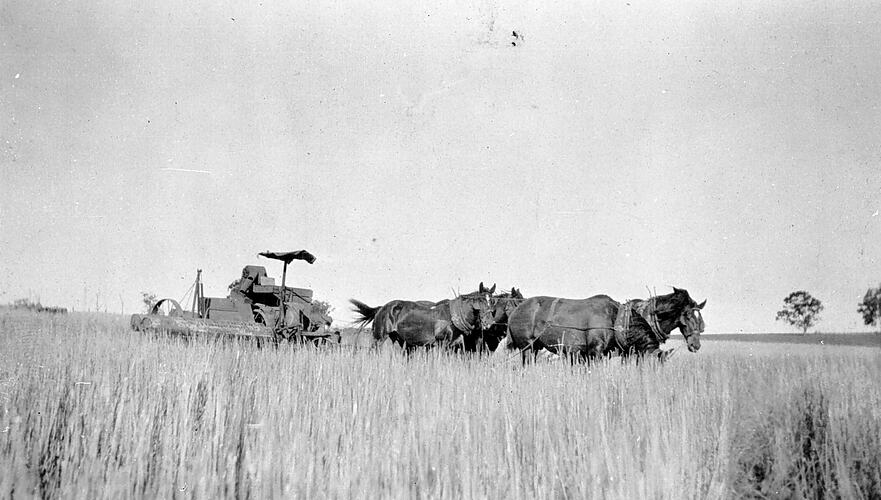A horse-drawn harvester in operation.