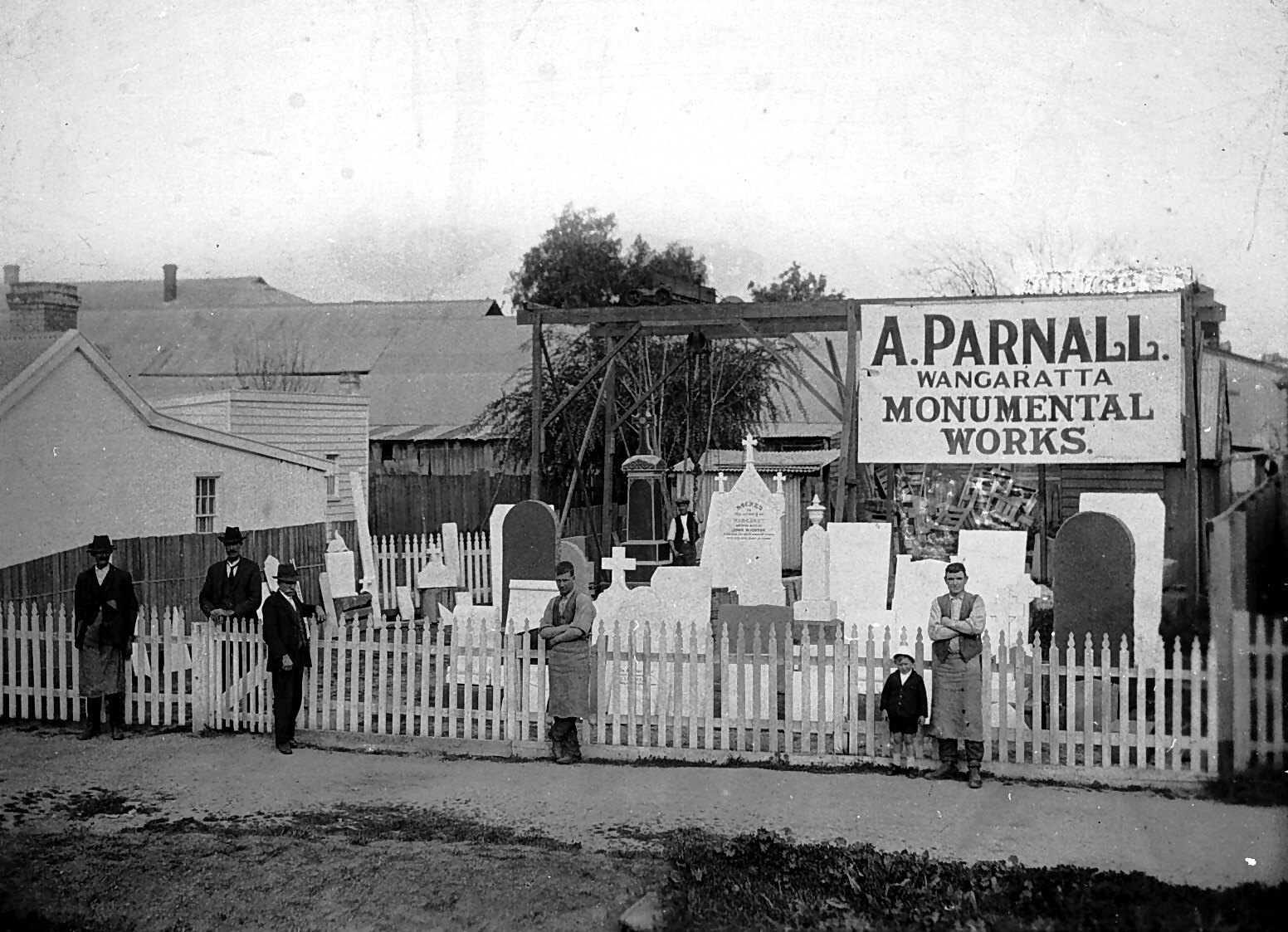 Five men and a young boy in front of the stonemason 's yard of A. Parnall, Monumental Works.