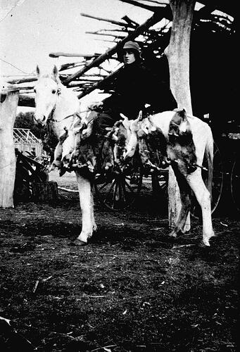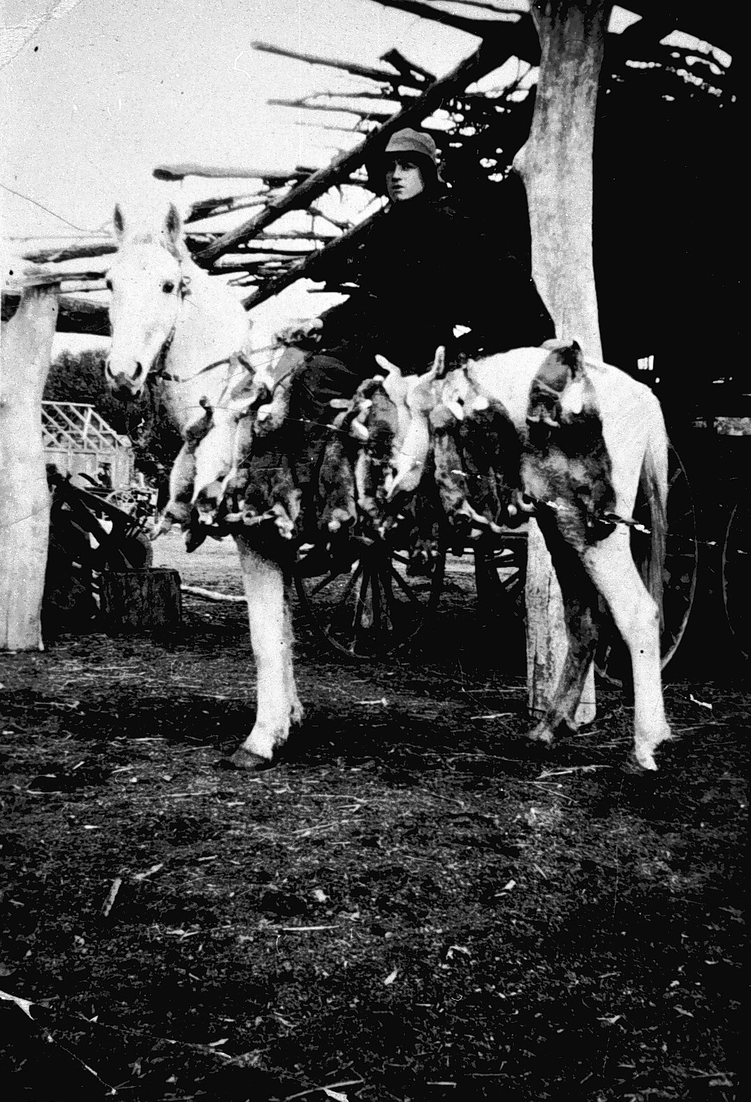 A boy on horseback with a catch of rabbits.