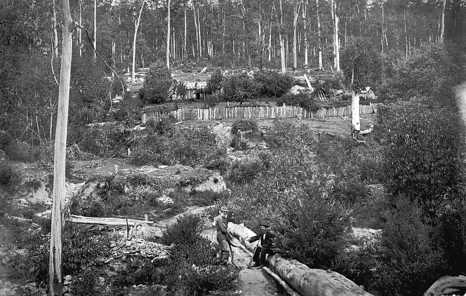 Miners ' huts in a valley. There are two men on a path in the foreground. There is a fence around the settlement.