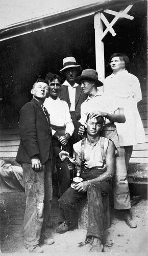 A group of men watching a boy get a haircut. There is a verandah in the background.