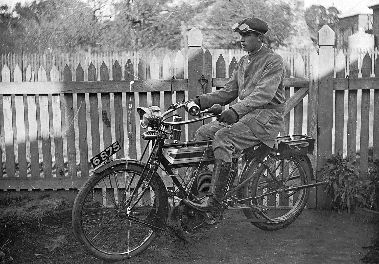 A man on a Triumph motorcycle inside a picket fence and gate. He is wearing goggles, gloves, a hat and knee length boots.