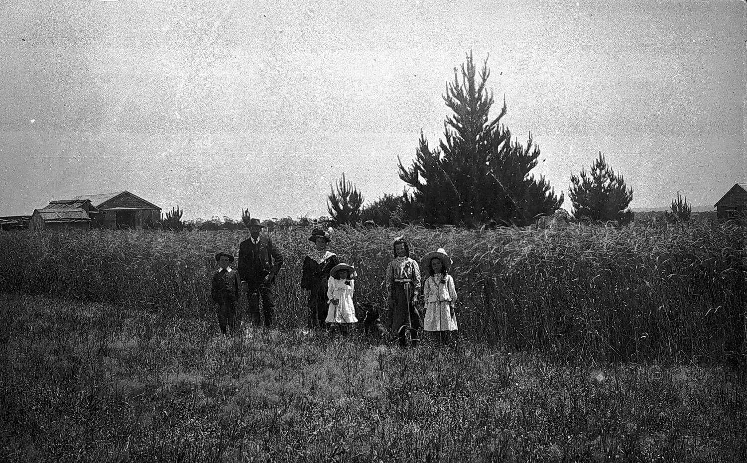 A family group, dressed in their best clothes, pictured in a wheat paddock in front of the crop. Farm buildings in the background.
