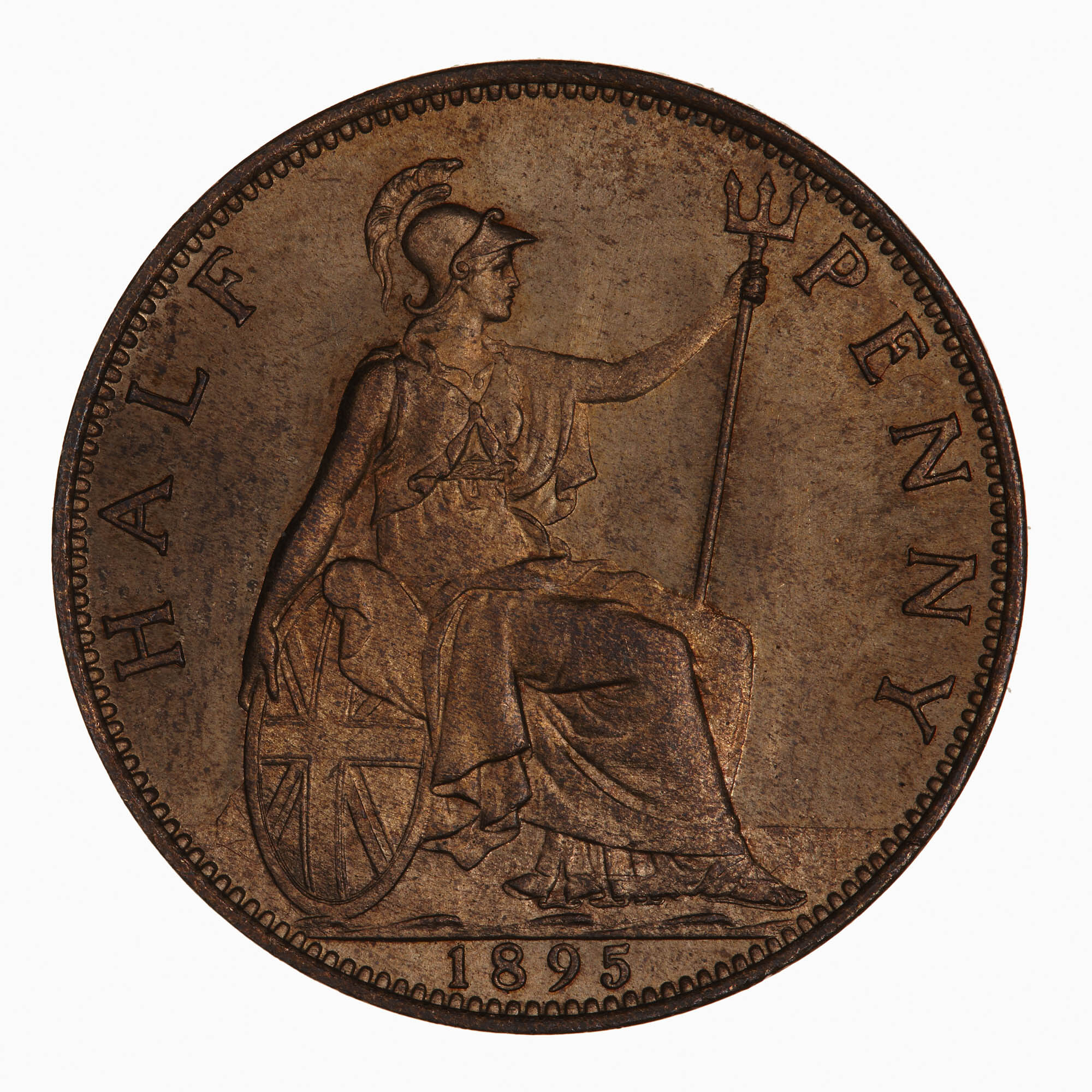 Britannia seated facing right on a rock wearing a helmet and flowing robes; she holds a trident and rests her right hand on a shield which bears the combined crosses of the Union Flag; around, HALF PENNY; in exergue, 1895.