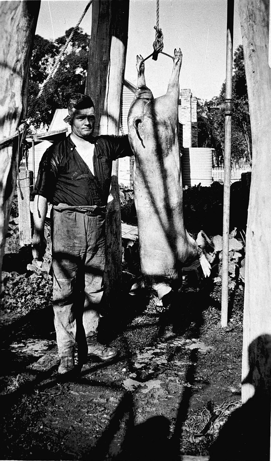 A man with a knife whoappears to be about to begin butchering a pig carcass that is hanging by the hind legs next to him.