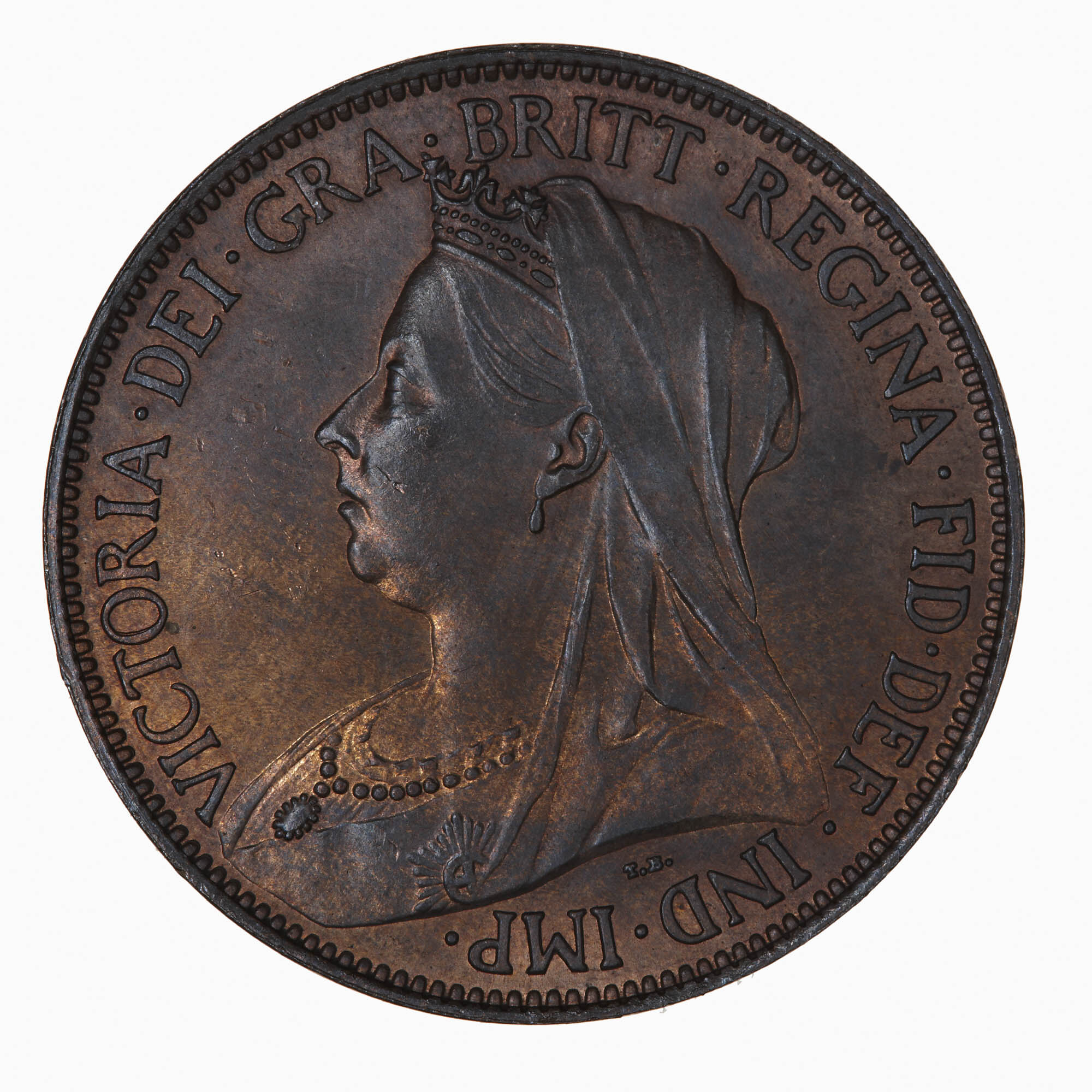 Crowned bust of the Queen facing left wearing veil over back of crown, ribbon and star of the Garter, pearl necklet and pendant; around, VICTORIA DEI GRA BRITT REGINA FID DEF IND IMP; in field below bust the artist's initials, T.B. (Thomas Brock)