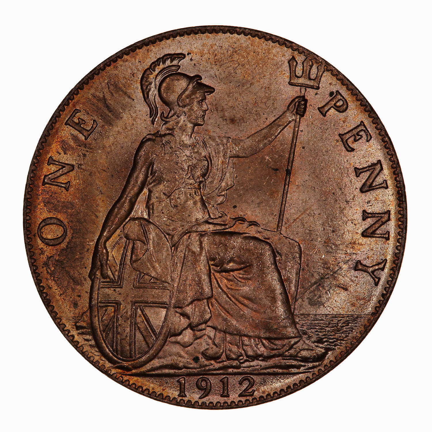 Britannia seated facing right on a rock wearing a helmet and flowing robes; she holds a trident and rests her right hand on a shield which bears the combined crosses of the Union Flag; around, ONE PENNY; in exergue, 1912