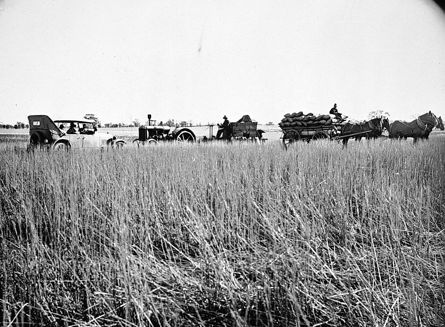 A car, tractor and a horse-drawn wagon loaded with grain sacks on B. Hancock 's property.
