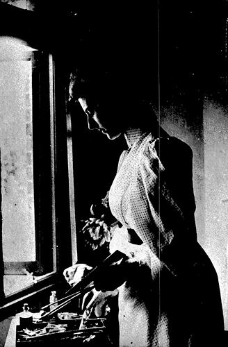 Young woman at an open window. There is a small table with tray of objects. She holds what looks like three long handled paint brushes and a square pallette. The objects on the tray could be artists supplies.