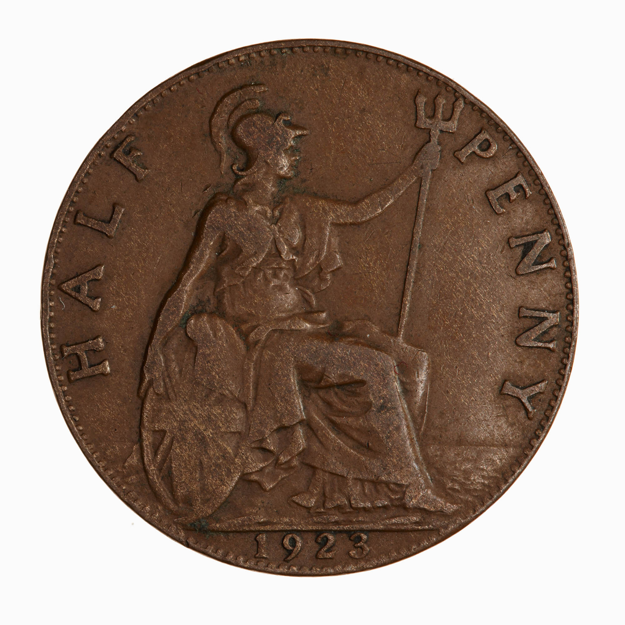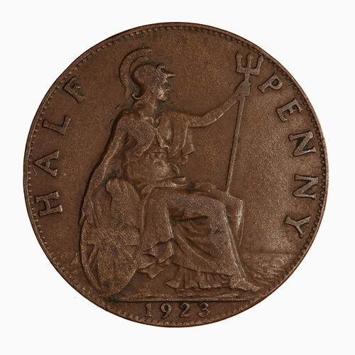 Britannia seated facing right on a rock wearing a helmet and flowing robes; she holds a trident and rests her right hand on a shield which bears the combined crosses of the Union Flag; around, HALF PENNY; in exergue, 1923
