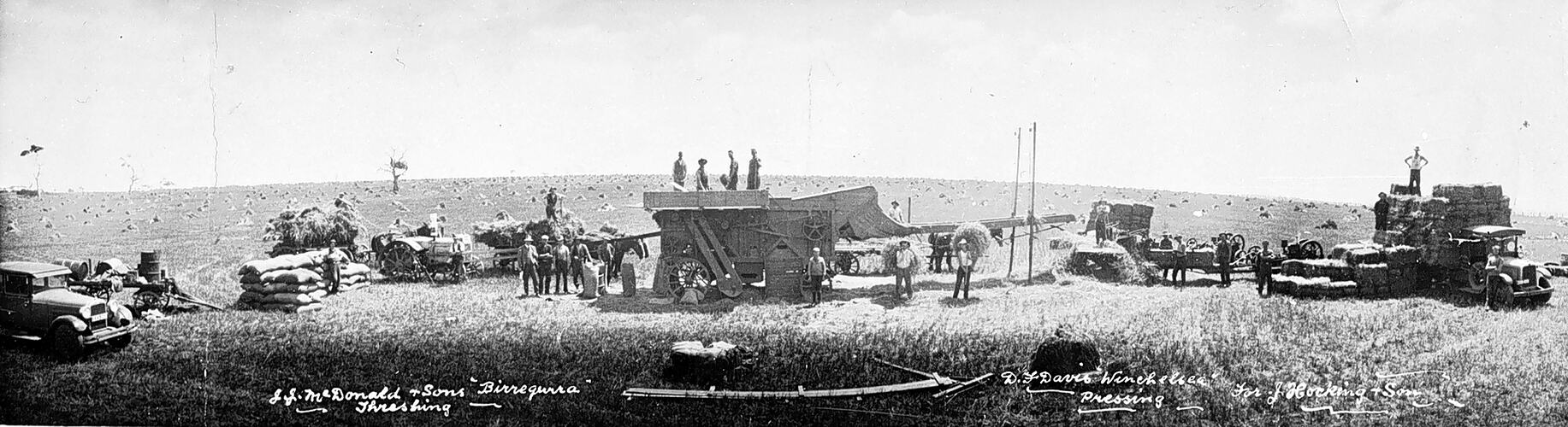 A panoramic view of a threshing operation.