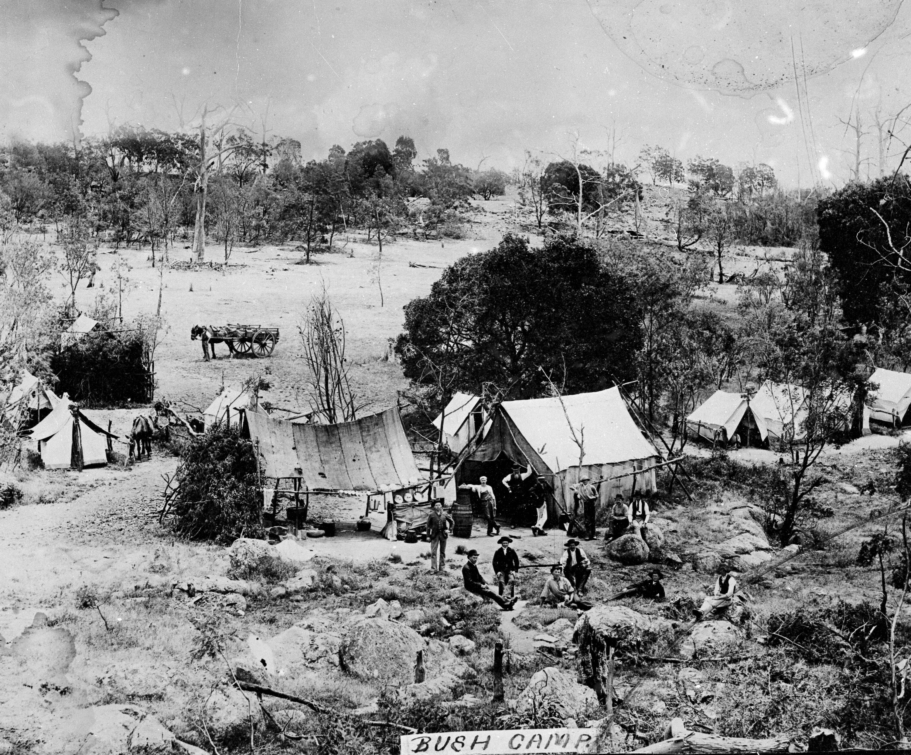 Negative of a gold mining camp near Kyneton, circa 1865.