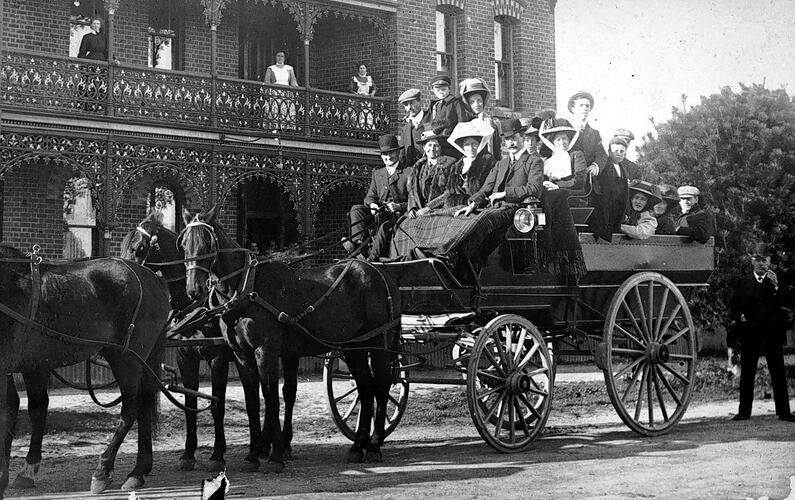 A group of people in a horse-drawn charabanc. In the background there is a guesthouse or hotel with two maids on the verandah.