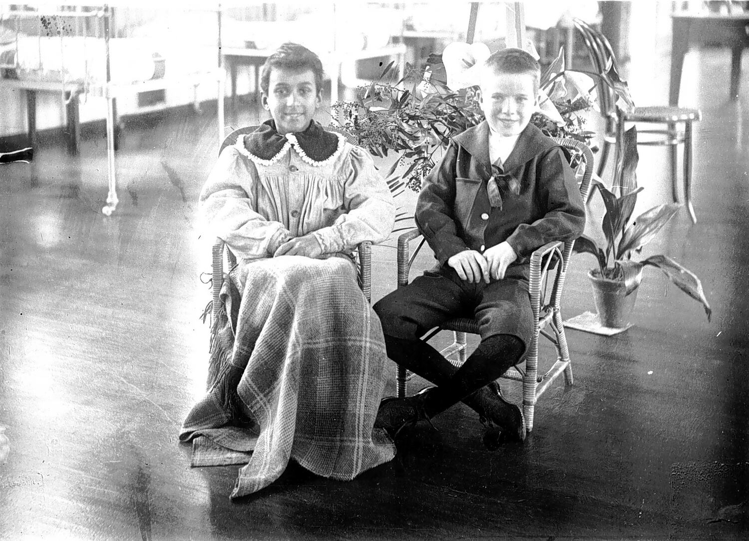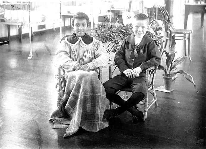 A hospital ward with two boys seated in chairs. One boy has a rug over his knees, the other may be a visitor. There is an aspidistra on the right.