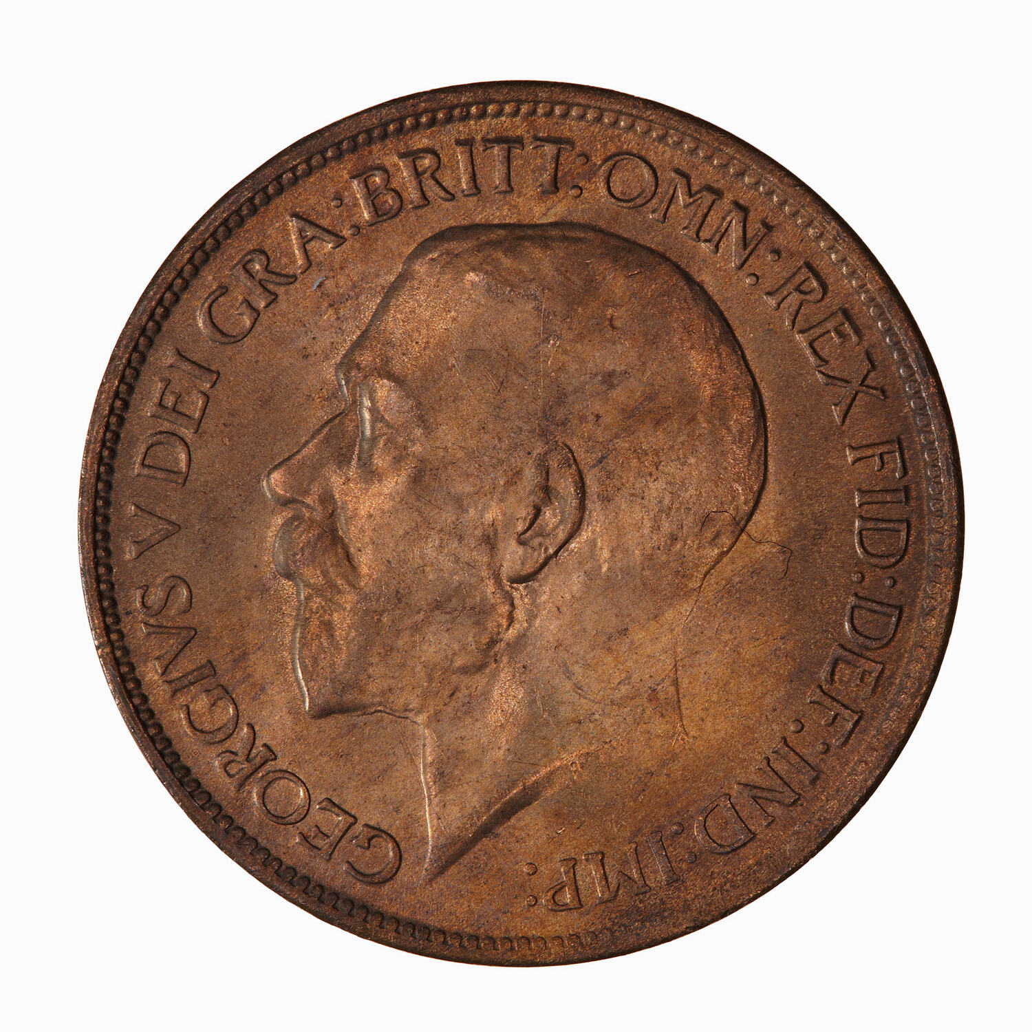 Bare head of the King facing left; below on neck truncation in small letters, B.M. (Bertram MacKennal); around, GEORGIVS V DEI GRA: BRITT: OMN: REX FID: DEF: IND: IMP: