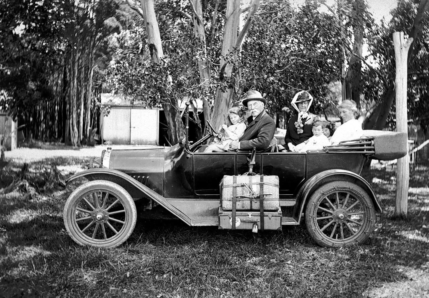 A group of people in a motor car. Suitcases have been strapped to the running board.