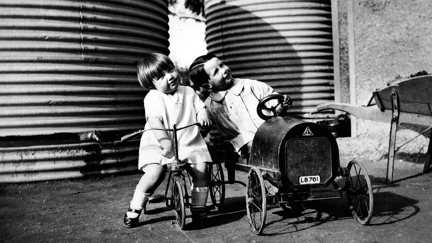 Two small children, one on a tricycle and the other in a toy car. There are two large water tanks behind them and a wheelbarrow on the right.