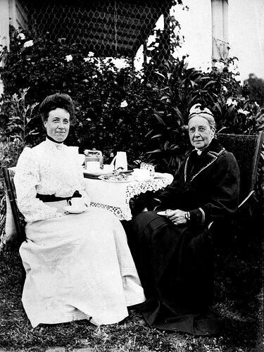Two women having afternoon tea in the garden of 'Mimosa' farm.