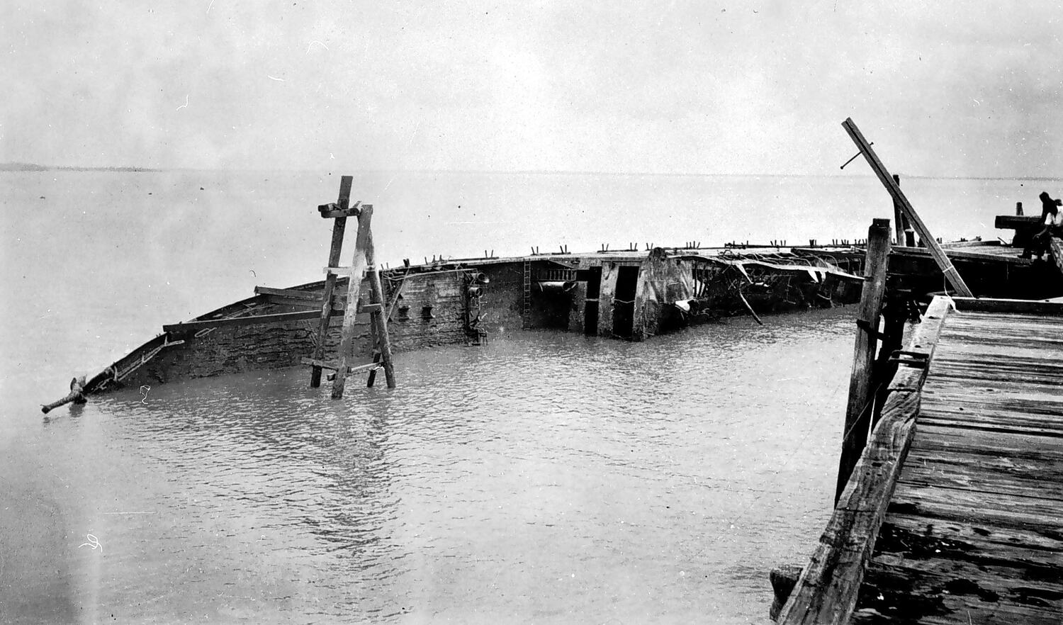 The MV Neptuna owned by Burns Philp which was sunk during the first air raid on Darwin. It had been unloading munitions at the wharf when Japanese carrier aircraft attacked the harbour on 19 February 1942. A total of 45 men were killed in the explosion that destroyed the vessel. The wreck was later partly removed by a Japanese scrap metal salvage firm.