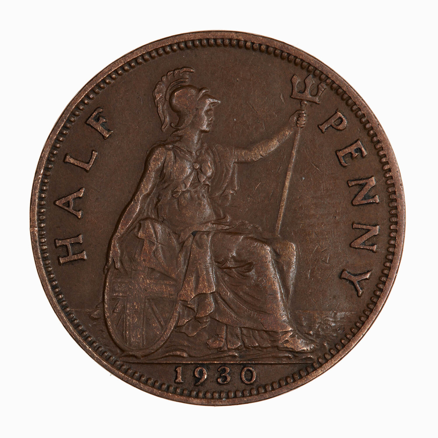 Britannia seated facing right on a rock wearing a helmet and flowing robes; she holds a trident and rests her right hand on a shield which bears the combined crosses of the Union Flag; around, HALF PENNY; in exergue, 1930