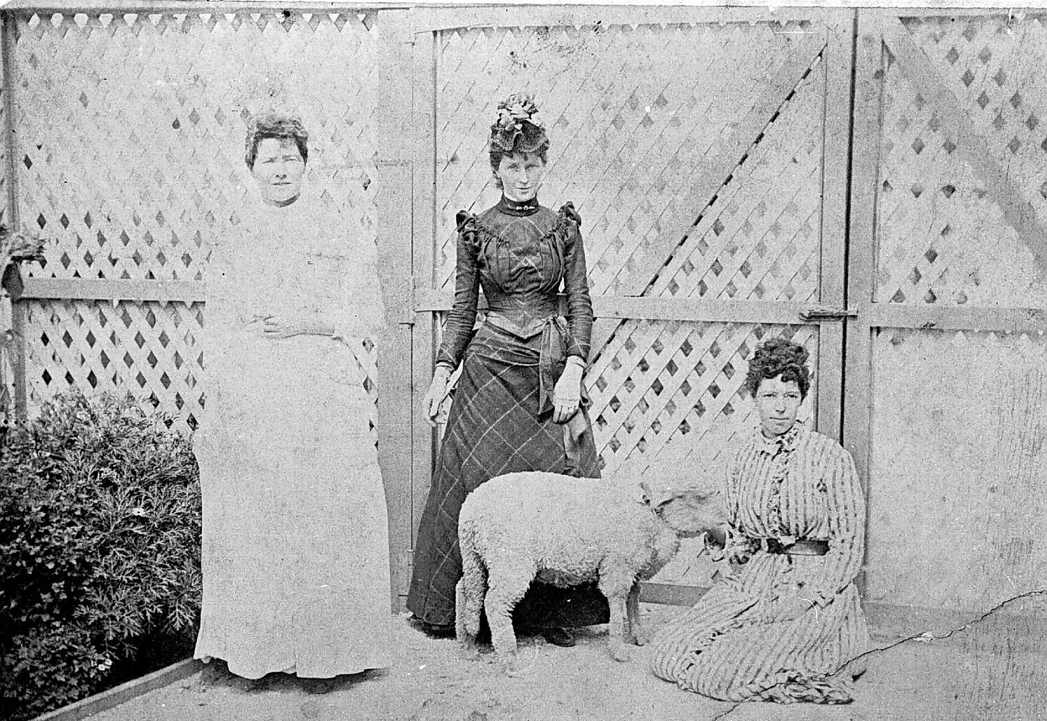 Three women with a pet lamb. They are standing in front of a large gate covered by lattice.
