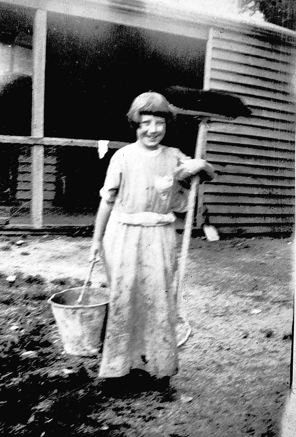 A small girl with a bucket and broom on 'Ivanhoe' farm.