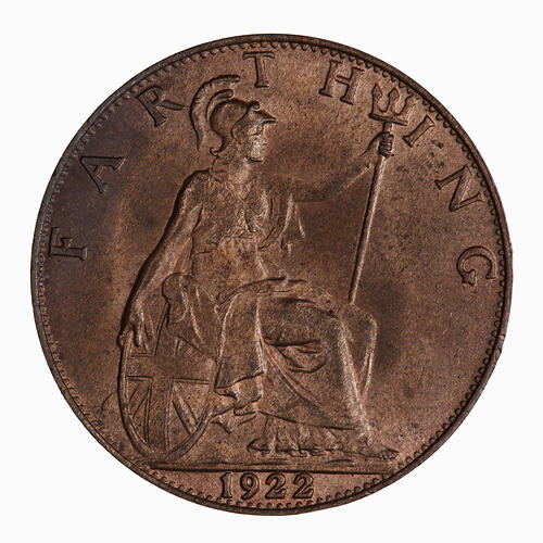 Britannia seated facing right on a rock wearing a helmet and flowing robes; she holds a trident and rests her right hand on a shield which bears the combined crosses of the Union Flag; around above, FARTHING; in exergue, 1922