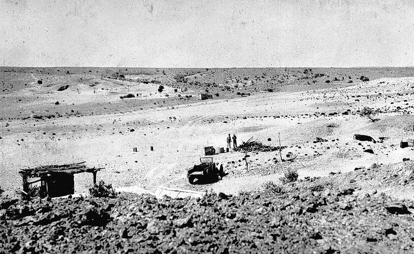 The opal fields at Coober Pedy. There are two men and a car in the centre of the photograph and a roofed shelter on the left.