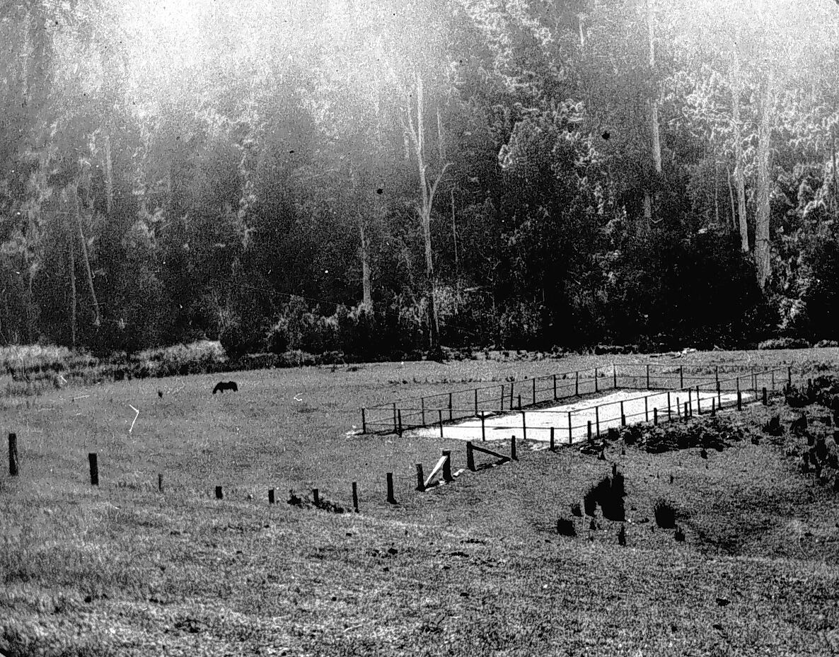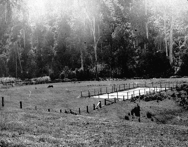 Prescott 's Tennis Court. The court has been set up in a paddock surrounded by bush land.
