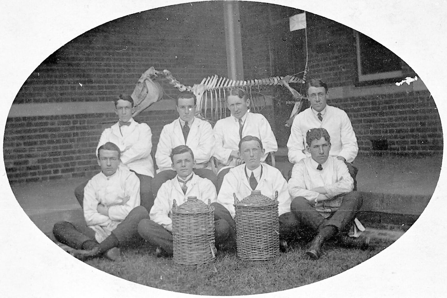 Veterinary students posed in front of a skeleton (of a cow?) at Melbourne University. There are two cane-covered demi-johns in front of the group.