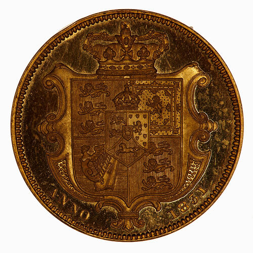 Garnished square topped shield, crowned; the shield is quartered with the arms of England (1 & 4), Scotland (2) and Irelend (3) with the crowned arms of the Dutch of Brunswick and Luneberg at the centre; around below, ANNO 1831